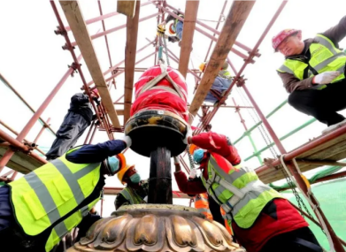 2021年4月6日,維修團(tuán)隊(duì)正式開始寶頂歸位工作,有十來名工人站在屋面處,利用可以手動操作的起重設(shè)備手拉倒鏈來一點(diǎn)點(diǎn)將寶頂緩緩抬升,歷經(jīng)40多分鐘,寶頂方被穩(wěn)穩(wěn)安放在屋頂處。